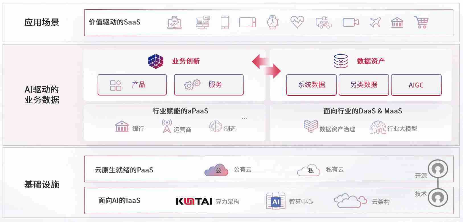 数字时代,,围绕企业数字化转型的关键要素,,,伟德国际1946bv数码开创性的提出数云融合战略和技术体系框架,,着力在云原生、、、数字原生、、AI原生和信创产业上架构产品和服务能力,,为处在不同数字化转型阶段的快消零售、、汽车、、金融、、医疗、、政企、、教育、、运营商等行业客户提供泛在的敏捷IT能力和融合的数据驱动能力,,,构建跨界融合创新的数字业务场景和新业务模式,,,,助力企业级客户建立面向未来的核心能力和竞争优势,,,全面推动社会的数字化、、、智能化转型升级。。。